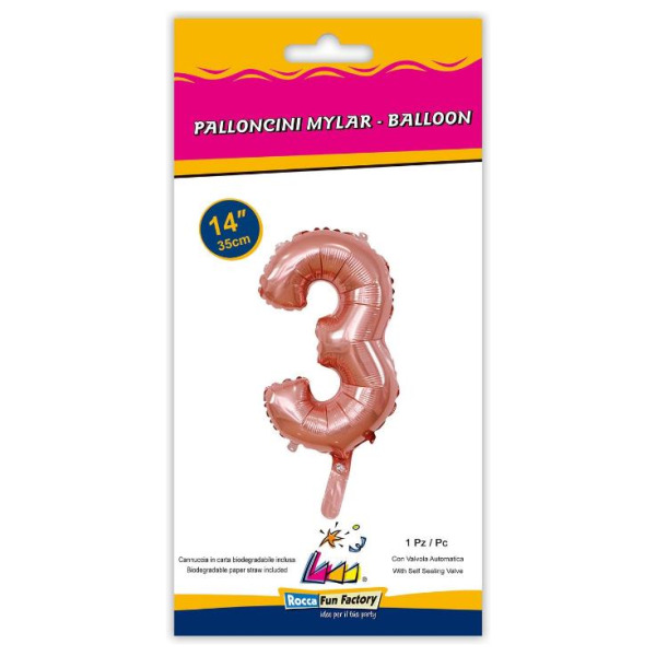 Pallone mylar numero 3 rosa gold mini 14''-35 cm con valvola