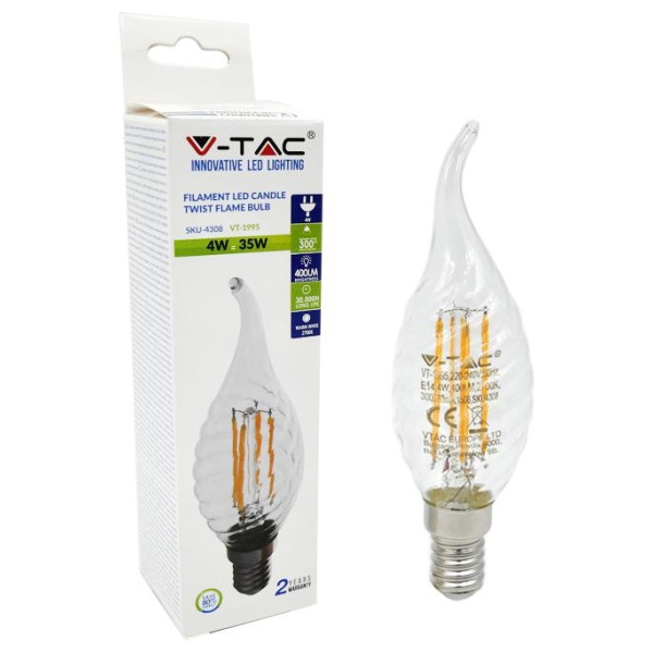 Lampadina v-tac sku 4308 led filamente spirale candela fiamma 4w e 14 bianco caldo 3000k