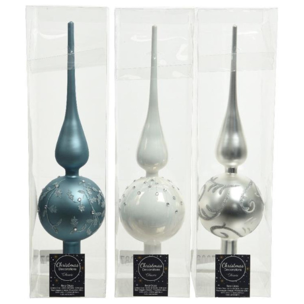 Puntale albero in vetro opaco con diamanti smaltati e glitterati 3 mod. ass blu/silver