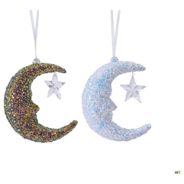 Addobbi luna in acrilico glitterata 2 mod. ass l3.50-w8.00-h11.00cm