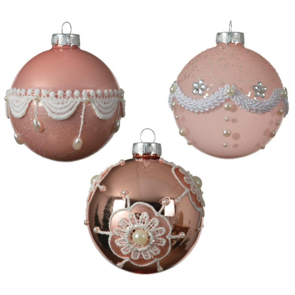 Pallina di vetro d.8cm opaca glitterata con diamanti e ricamo 3 mod. assortiti colore rosa