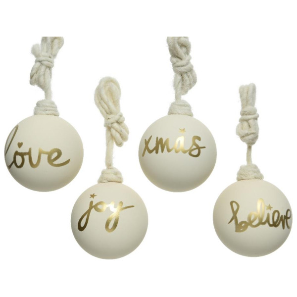 Pallina d.10cm di vetro colore oro verniciata con testo 4 mod. assortiti col.bianco