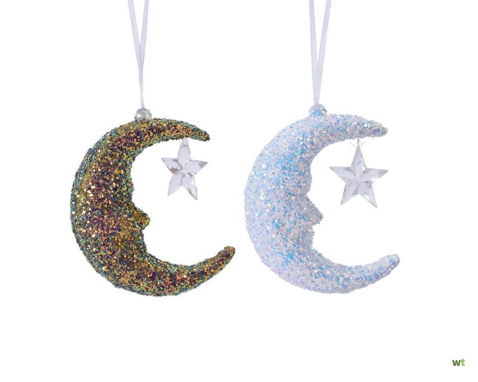 Addobbi luna in acrilico glitterata 2 mod. ass l3.50-w8.00-h11.00cm