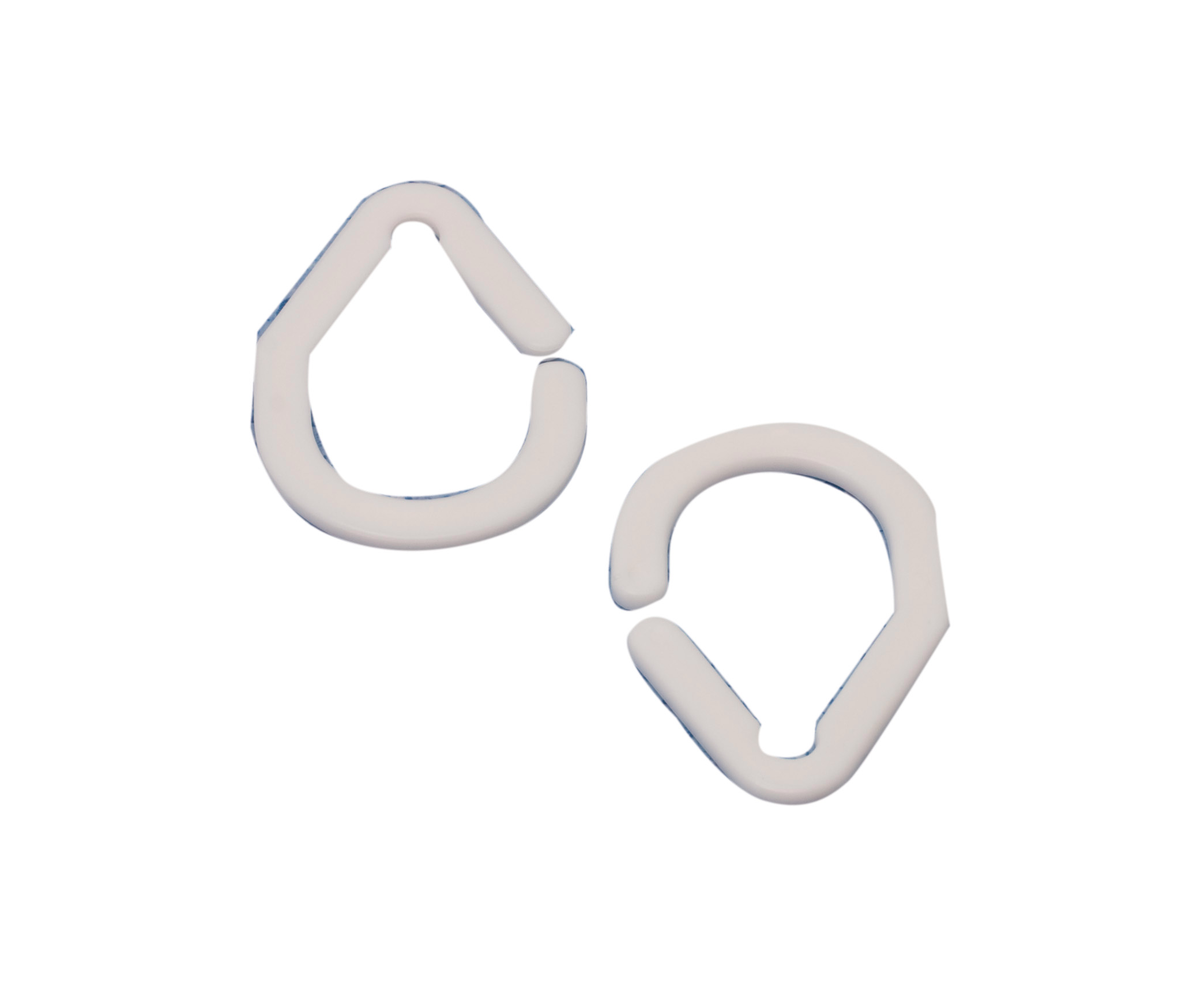 Busta da 16 anelli a forma di goccia per tenda doccia realizzati in plastica bianca.