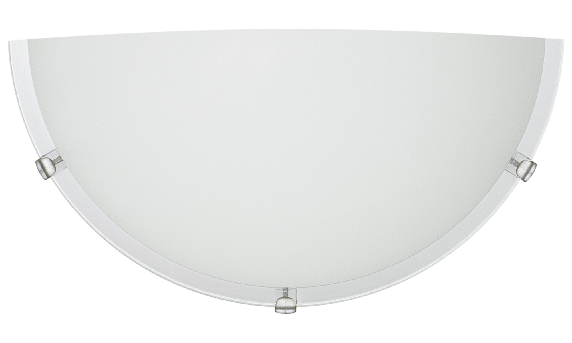 Applique per parete semitondo con montatura in metallo verniciato bianco e ganci in plastica cromo, vetro in lastra spessore 3 mm serigrafato bianco lucido. Attacco E27 (grande) – 220/240V – 50 Hz – IP20. Max wattaggio lampadina 57W (non compresa). Peso 2,30 kg.