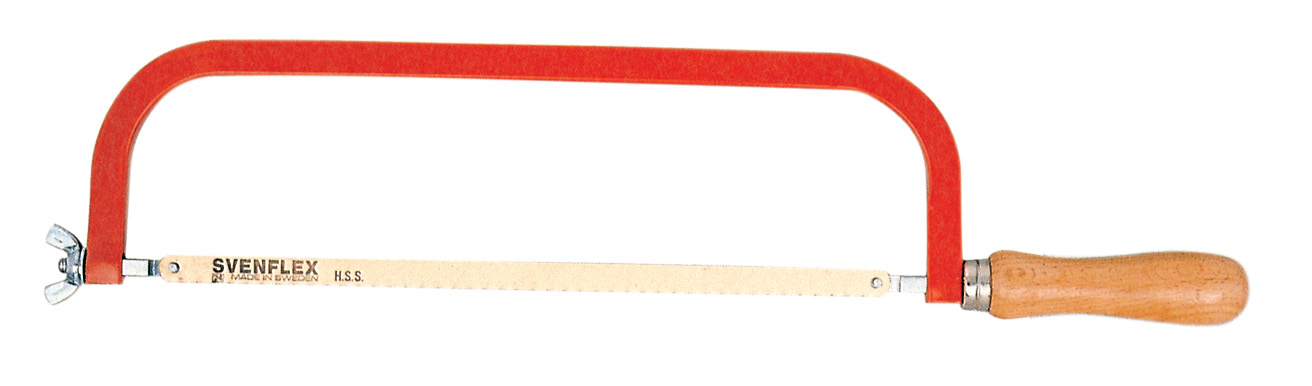 in acciaio tubolare piatto 16 x10 x1,35 mm verniciato a forno, lama al carbonio e impugnatura in legno. Attacchi lama quadri sfilabili 7 mm. Tendilama a galletto. Con lama da 300 mm. Peso 375 g.