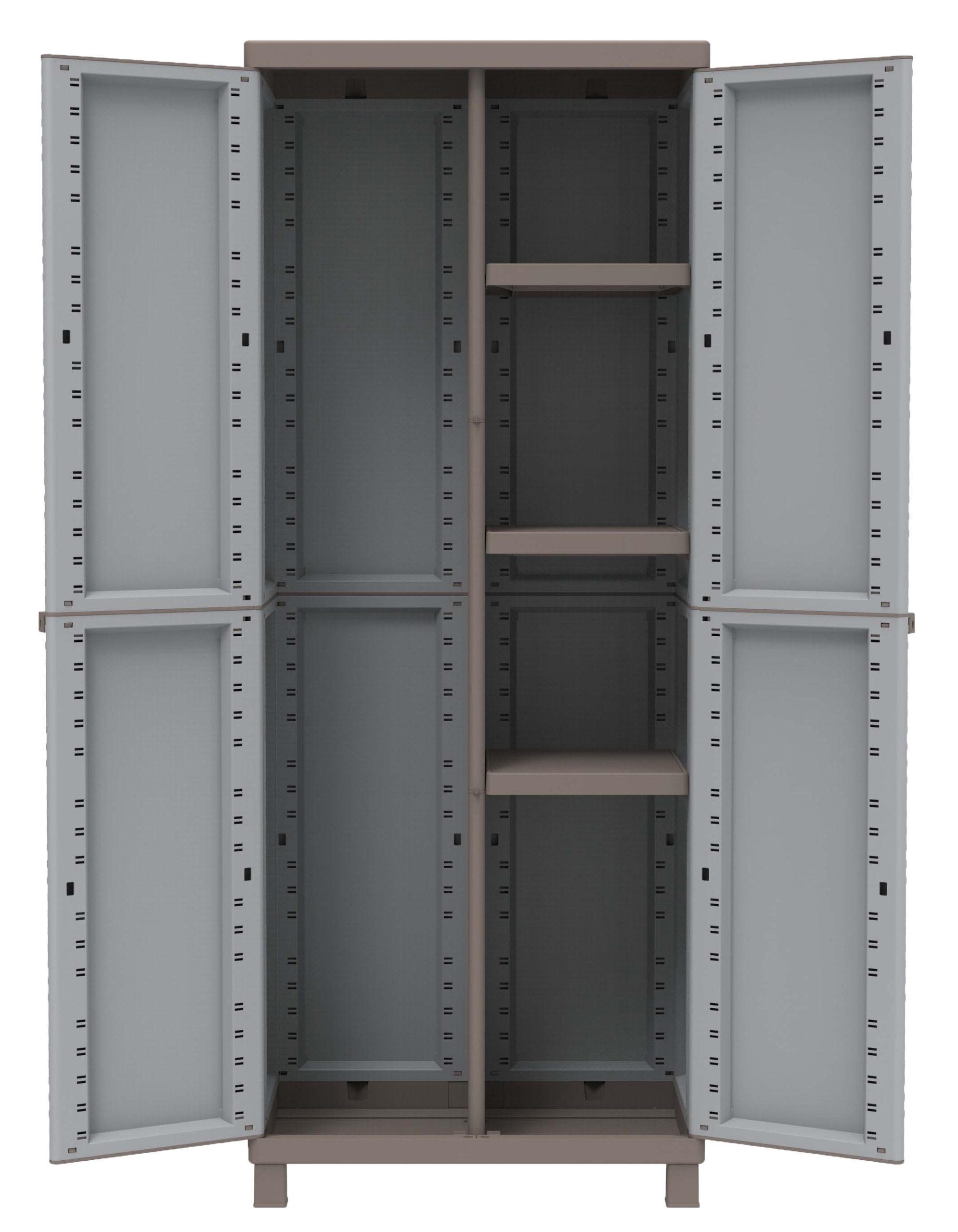 Serie C-RATTAN Art. PS3680 in polipropilene, finitura effetto rattan. Ottima resistenza agli agenti atmosferici. Doppia anta, tre ripiani interni e vano portascope. Ripiani regolabili in altezza. Portata ripiano 10 kg Possibilità di chiusura con lu