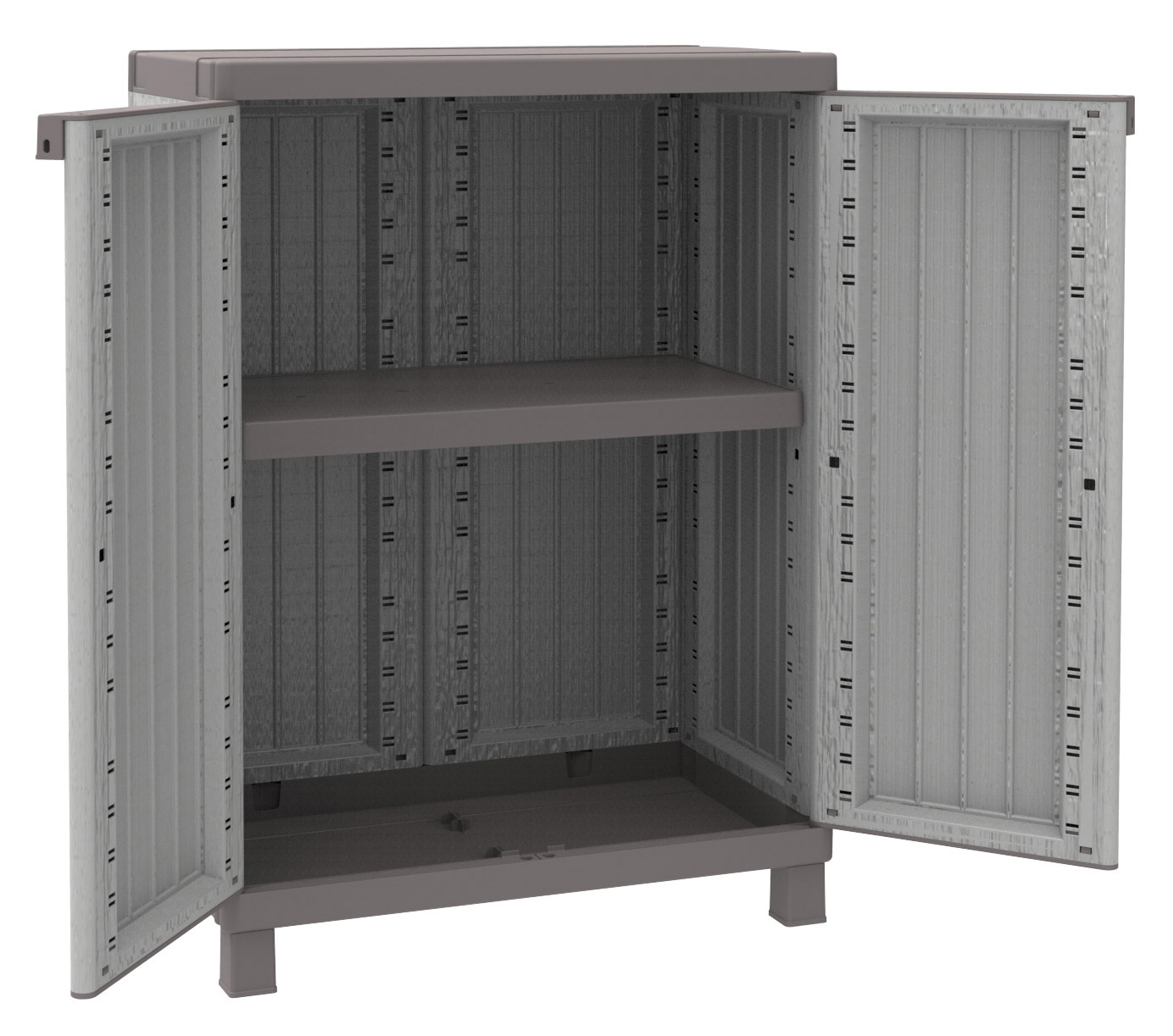 Serie C-WOOD Art. 680 in polipropilene, finitura effetto legno. Ottima resistenza agli agenti atmosferici. Doppia anta, un ripiano interno. Ripiano regolabile in altezza. Portata ripiano 20 kg uniformente distribuiti. Possibilità di chiusura con lu