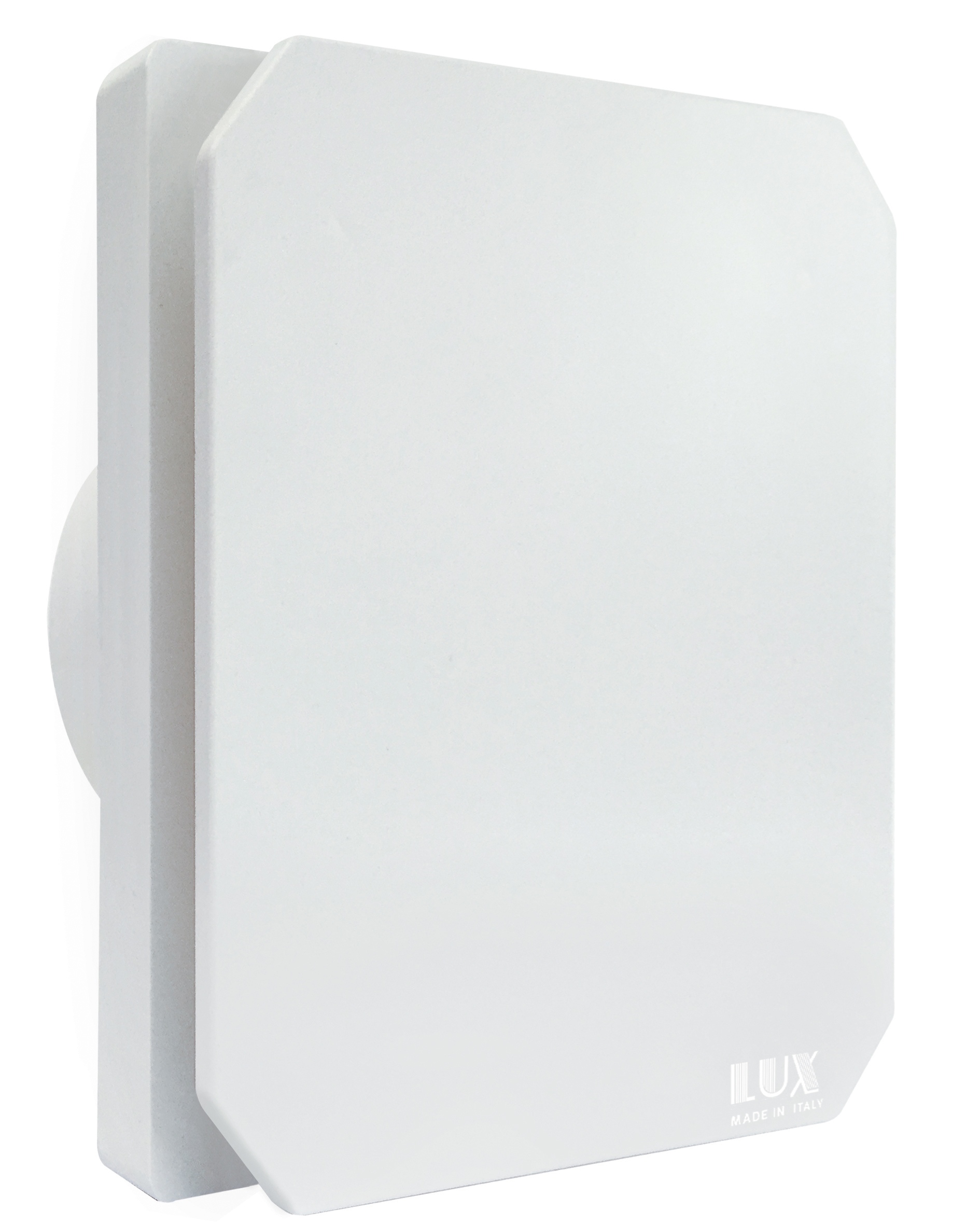 Mod. LUX318 in materiale termoplastico. Applicazione a parete. Apertura e chiusura automatica. Sensore di umidità regolabile (min.10% – max 90%). Foro uscita aria 10 cm. Portata 100 mc/h. Consumo 15 W.