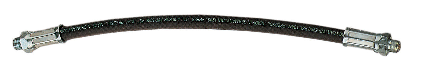 alta pressione per compressori e pistole dingrassaggio. Raccordi in acciaio zincato. Filetti M 10 x 1. Pressione desercizio 200 – 400 Bar. Pressione di scoppio 800 Bar. Lunghezza 300 mm.