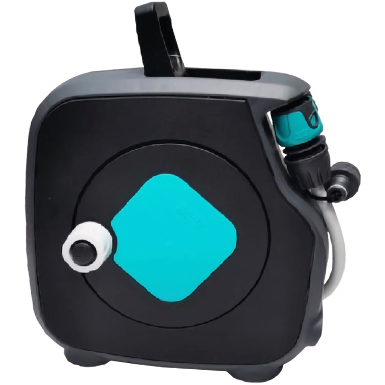 Mod. AQUA BAG struttura in resina, polipropilene e ABS. Completo di: – 11,5 m di tubo (10 m interni riavvolgibili + 1,5 m esterni) – Lancia a portata variabile – 2 raccordi ad aggancio rapido softouch – Presa rubinetto da ? con adattatore da cuci