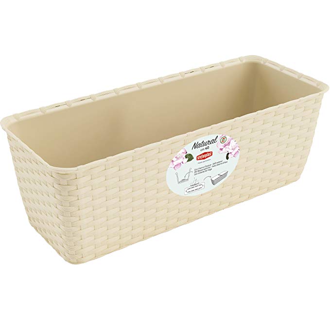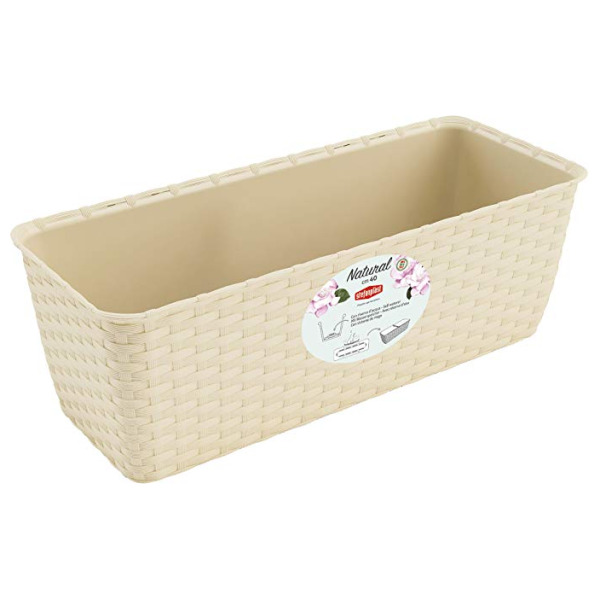Vaso rettangolare in plastica effetto rattan, dalle linee moderne che lo rendono adattabile ad ambienti sia interni che esterni. Balconetta che non necessita di sottovaso perchè dotata al suo interno di una griglia alta circa 3 cm che funge da riserva di 0,7 lt d’acqua.