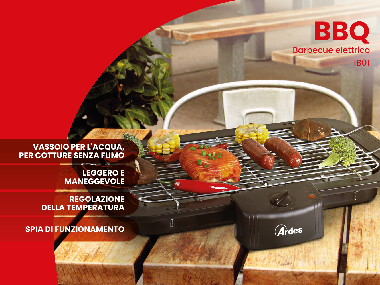 Mod. ARDES AR1B01 Potenza 2.200W – 230V – 50 Hz. Leggero e maneggevole, è dotato di griglia removibile in acciaio cromato da 22×38 cm. Vaschetta per l’acqua, per una cottura senza fumo. Griglia lavabile in lavastoviglie. Regolazione della temperatura. Spia di funzionamento. Dimensioni 47,5 x 35 x 10 cm. Peso 2 kg.