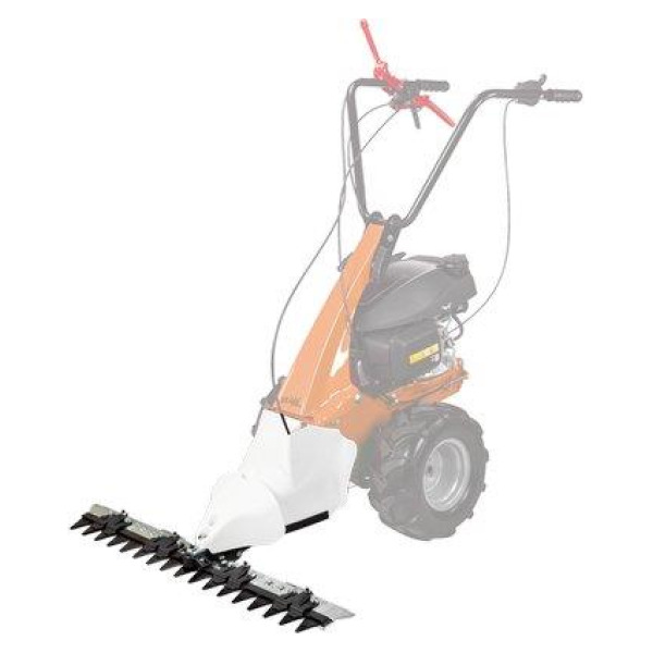 Accessorio per Multiattrezzo Minieffe Art. 6226831. Movimento monolama brevettato con attacco centrale. Larghezza di lavoro Cm. 87. Altezza di taglio da Cm. 2,5 a 5,0. Testina con ingrassatore. Cofano spargierba doppio e flottante.