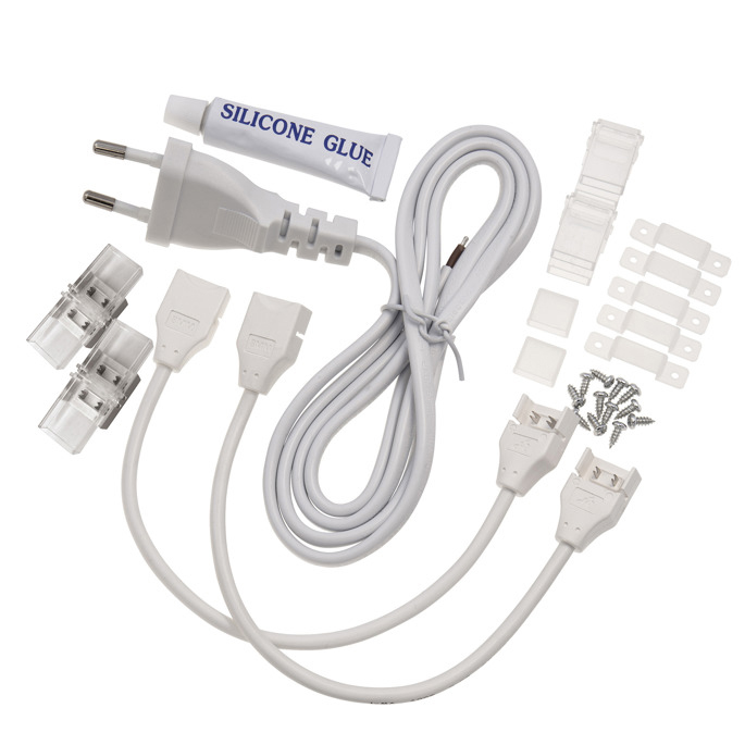 Kit aggiuntivo per Strip LED COB 230V da 10W. Contiene 2 testate terminali stagne, 1 cavo di alimentazione, 4 connettori, 1 tubo di sigillante, accessori per il fissaggio.