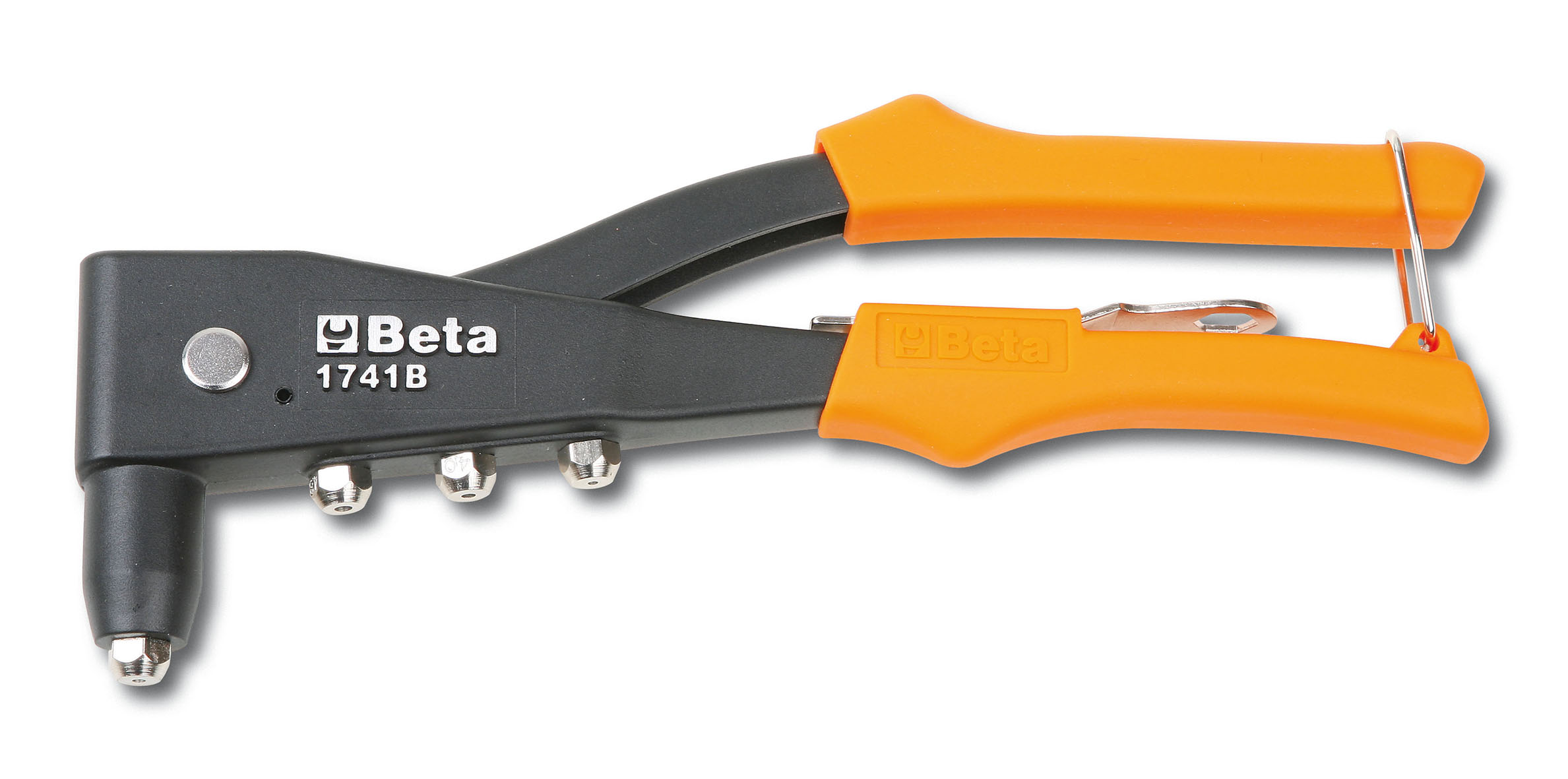 Art. 1741 B struttura in lega leggera con impugnatura in materiale plastico. Con 4 testine intercambiabili. Con chiave di servizio. Diametro rivetti 2,4 – 3,2 – 4,0 – 4,8 – 5,0 mm. Dimensioni 260 x 75 x h 25 mm. Peso 558 g.