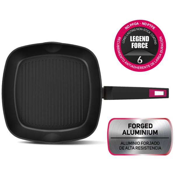 è una griglia in alluminio forgiato di 28 x 28 cm. Antiaderente in alluminio la puoi utilizzare in ogni tipo di cucina: vetroceramica, fornello elettrico, gas o induzione. No PFOA. No PTFE. Lavabile in lavastoviglie.