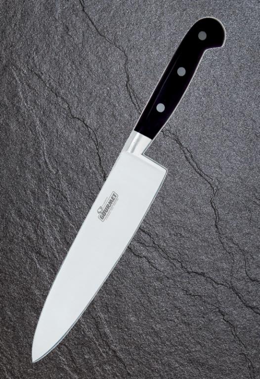 Questo modello di coltello permette le lavorazioni più varie ed è sicuramente lo strumento che passa più tempo nelle mani di un cuoco occidentale. È sempre stato il coltello con cui si fa più o meno tutto al tagliere. Eccellente per forma e diimensione per tagliare, fare triti, cubettare e generalmente anche affettare qualunque tipo di alimento: carne , pesce, verdure, frutta e formaggi a pasta rigida o semi rigida. Quando si sceglie un trinciante controllate sempre di avere lo spazio sul tagliere per poterlo adoperare senza rovinare la punta vicino altri oggetti e tenendo presente il fatto che dovrete spesso utilizzarlo a ghigliottina tenendo la punta vicino al tagliere e facendo muovere la parte iniziale della lama. Una valida alternativa – per il professionista – alla classica mezzaluna domestica.