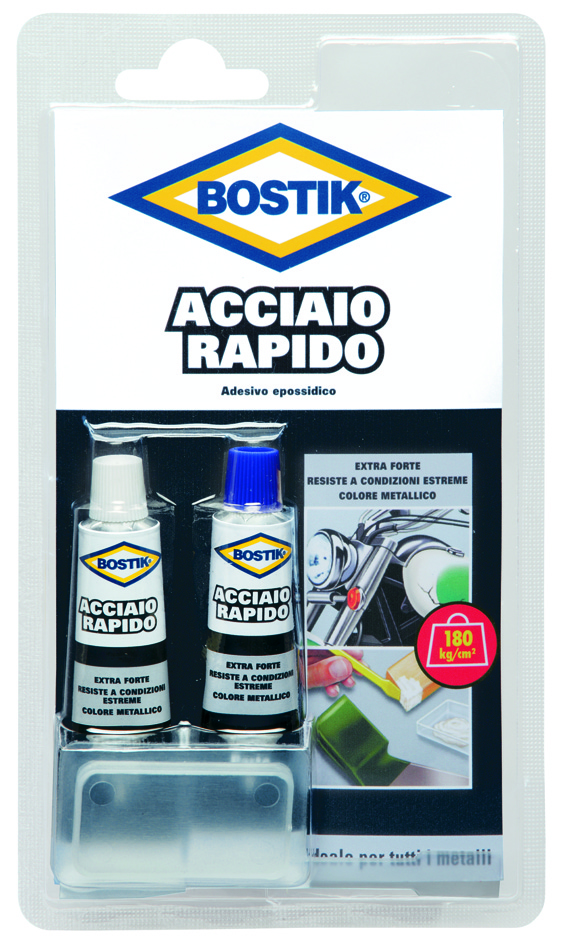 adesivo epossidico bicomponente di colore acciaio naturale. Ideale per incollare metalli tra loro e con altri materiali. Adesivo (epossidico) bicomponente di color metallo ed extra-forte 180 kg/cm. Super rapido 5 minuti. Di color metallo. Resistente a condizioni difficili. Riempitivo. Resistente allacqua (di mare). Ottima resistenza alle sostanze chimiche. Dopo lindurimento pu essere smerigliato, carteggiato, levigato e verniciato. Adatto a riparazioni molto resistenti di oggetti in metallo che devono resistere a condizioni difficili (sforzi, vibrazioni), come utensili, componenti automobilistici, motori, ciclomotori, biciclette, cancellate (di giardini) o posate. Idoneo anche per stuccare piccoli fori nel radiatore. Adatto anche per lincollaggio di metallo combinato a pietra, legno, calcestruzzo e materiali sintetici come formica, poliestere e resina. Tubetto da 15+15 ml.