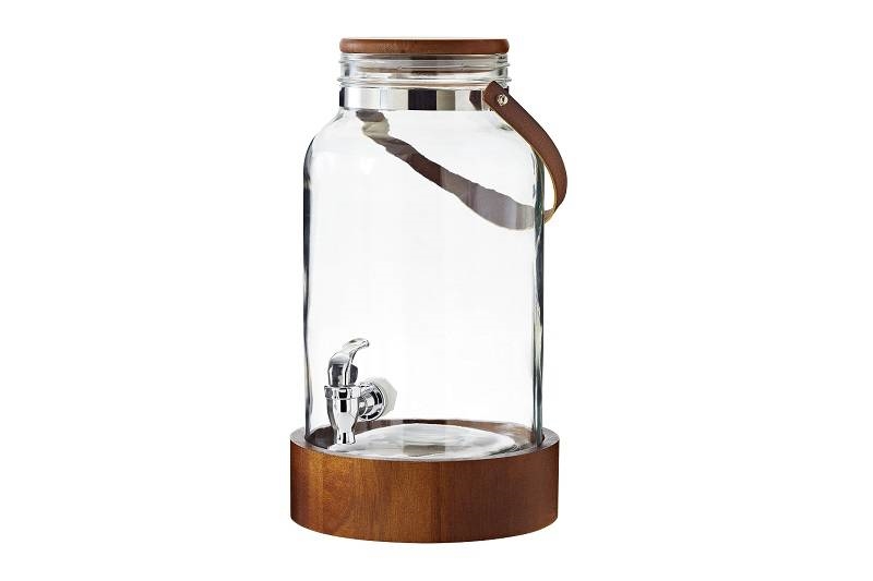 Big jar con supporto in acacia con manico; brocca da 6 litri con rubinetto.