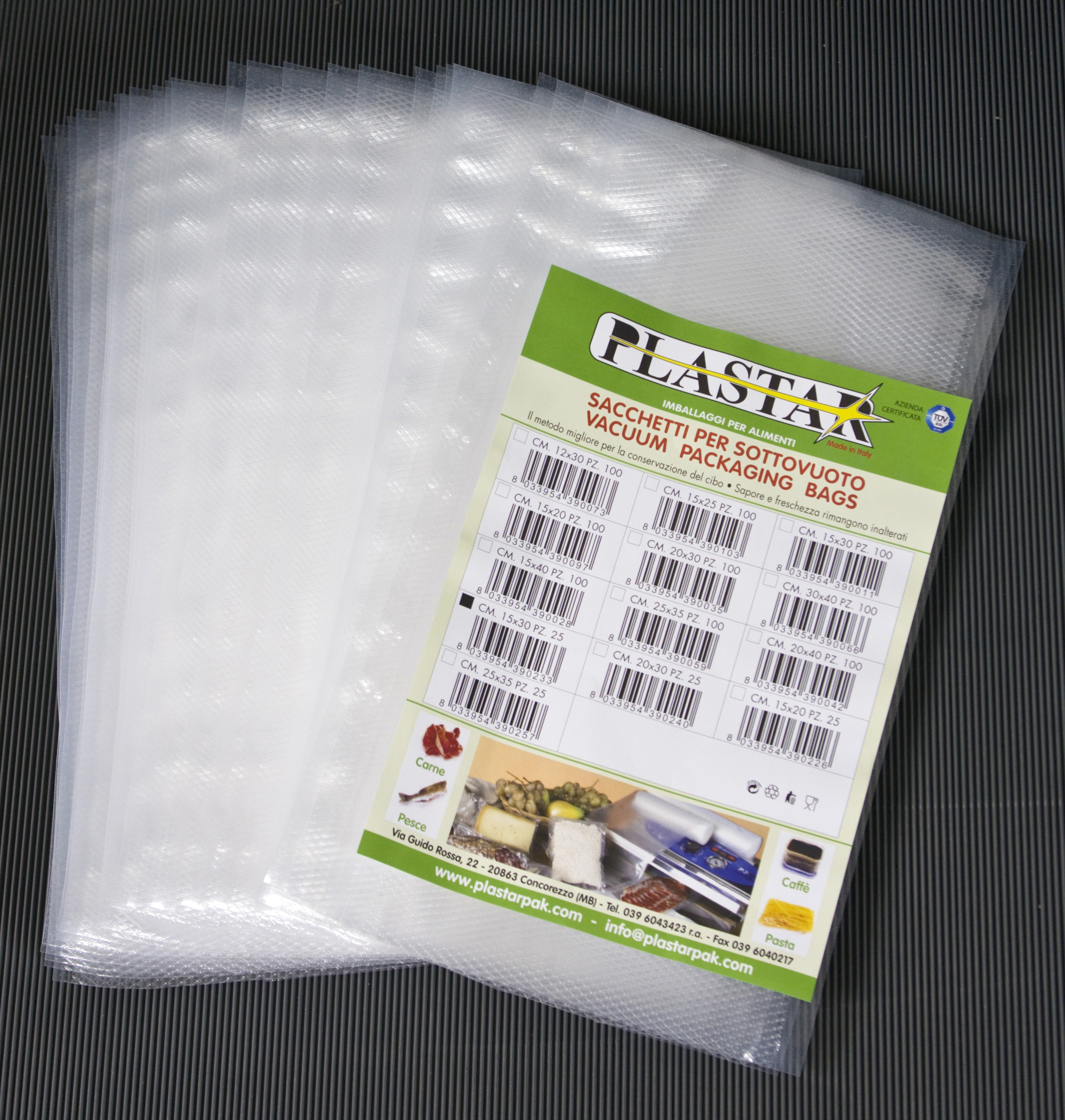 goffrati, in nylon politene per uso alimentare per una perfetta tenuta sottovuoto. Le buste sono idonee all’utilizzo ad una temperatura di 70 C° per un max di 2 ore oppure a 100 C° per max 15 minuti. Dimensioni 15 x 40 cm. Confezione da 25 sacchetti.