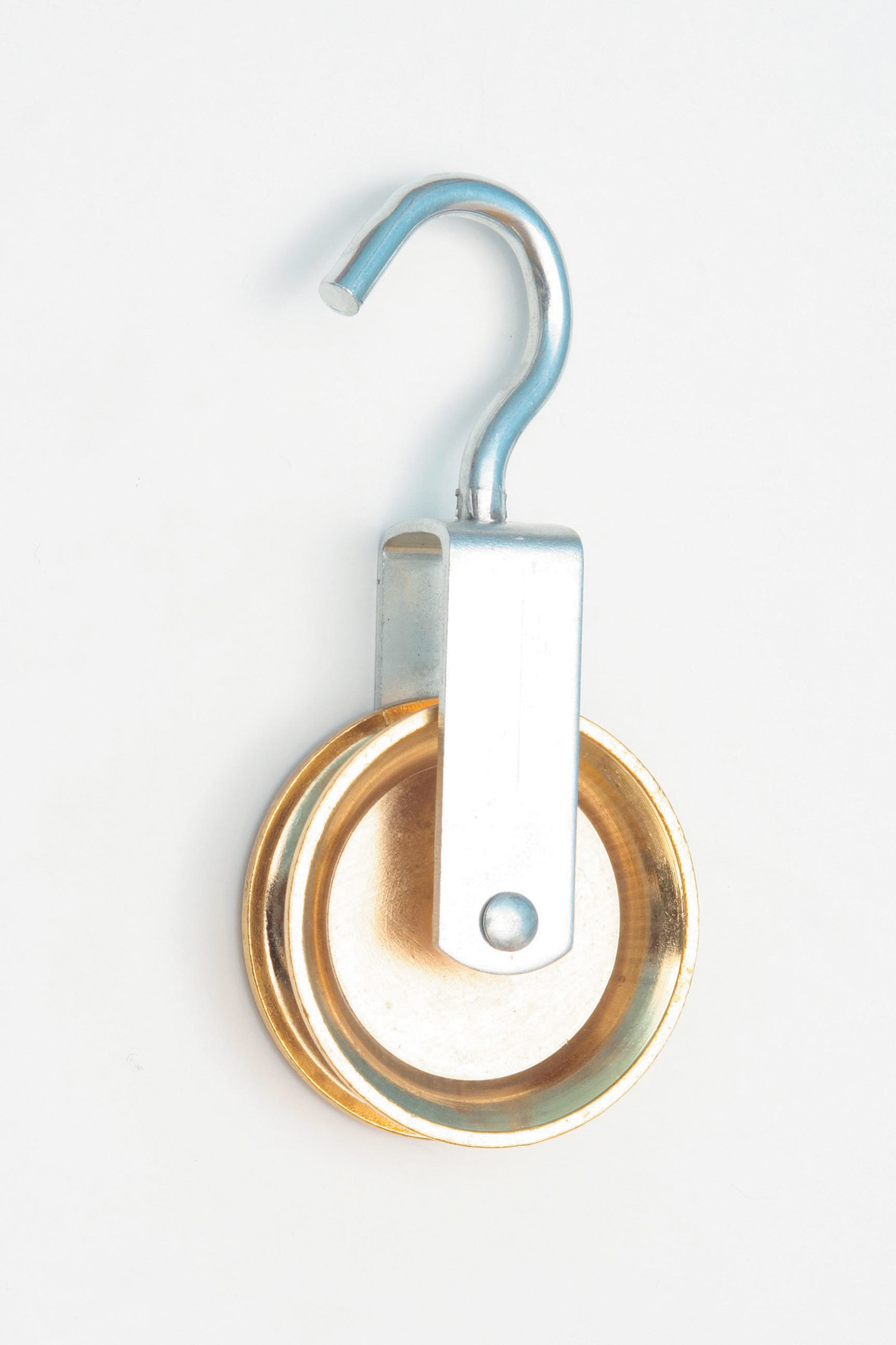 gancio girevole in acciaio zincato. Ruota in zama ottonata. Diametro 30 mm.