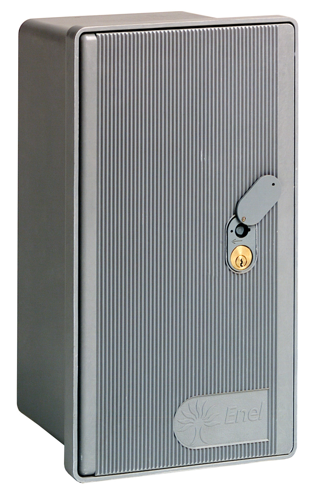 Mod. GMI / ENEL corpo stampato in vetroresina. Sportello amovibile o apribile a 110°. Applicabili ad incasso, a parete, a palo o su basamento. Colore grigio RAL 7001. Grado di protezione IP 44 Per contatore monofase. Con serratura. Dimensioni cm 2