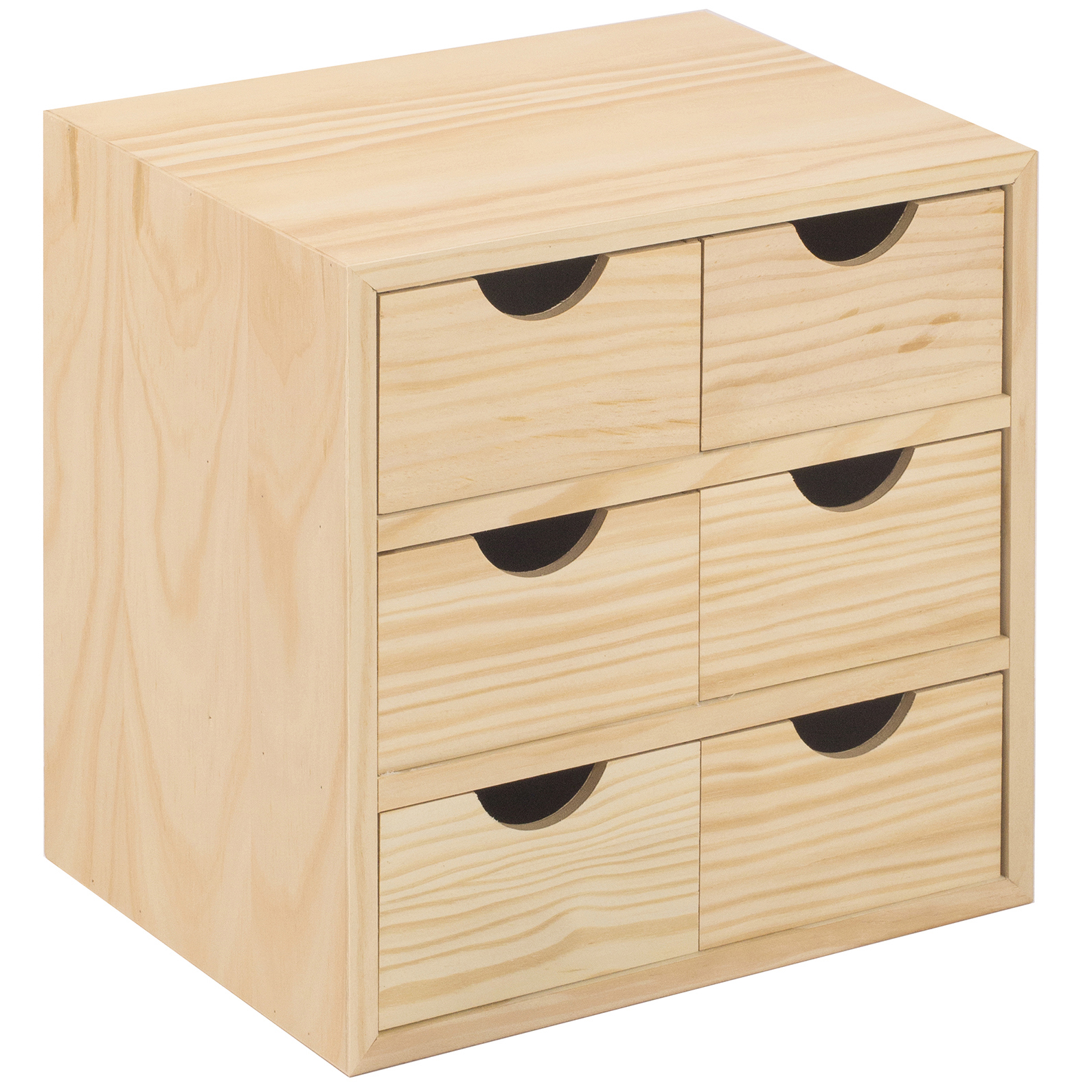 Contenitore multiuso a sei cassetti in legno impiallacciato pino massiccio grezzo, PEFC spessore 11 mm. Prodotto già montato. Dimensioni 280 x 200 x h 280 mm.