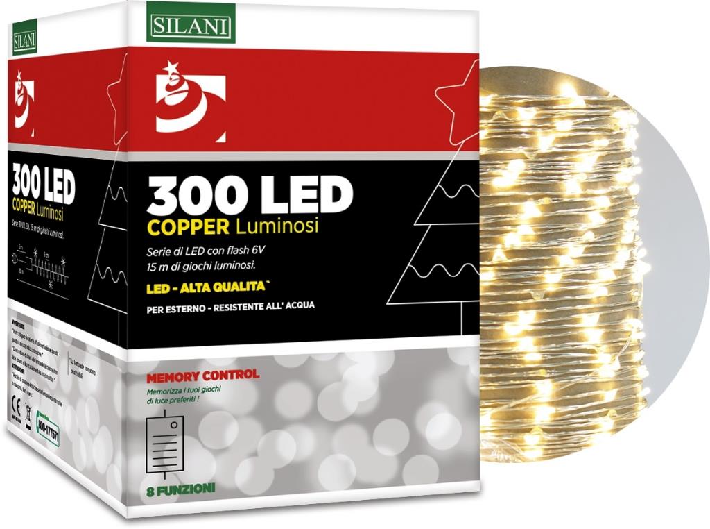 Luci 300 Microled per uso interno ed esterno di colore bianco caldo, con luce fissa e flash led di colore bianco freddo, filo in rame argentato. Alimentazione 220V, 12V, 6W, IP44. Lunghezza totale mt.20, lunghezza cavo di alimentazione mt.5, un led ogni cm.5.