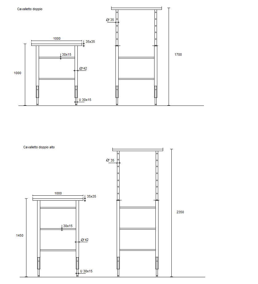 Altezza variabile da 100/170 cm.Carico massimo uniformemente distribuito 300 kg.Carico massimo accidentalmente concentrato 150 kg.Tubi in acciaio S235JRDiametro tubo esterno Ø 42 mm.Diametro tubo interno Ø 35 mm.Tubolare per appoggio 35x35x1000 mm.Gambe fisse in ferro U 30×4 mm.Traverse tubolare 30x15x1,5 mm.Ganci Ø 8 mm.