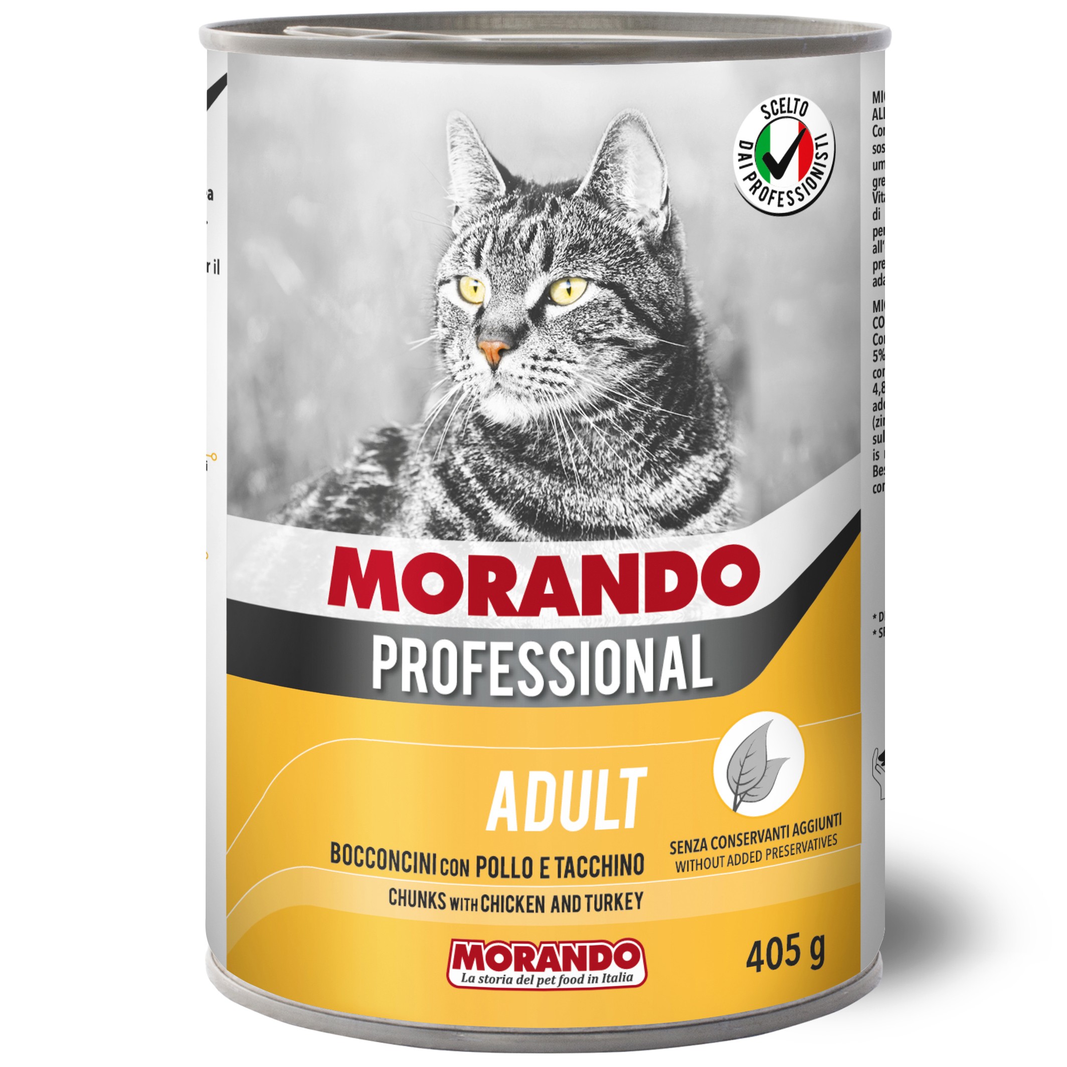 Bocconcini al gusto di pollo e tacchino. Ricetta facilmente digeribile e altamente appetibile. Muscolatura forte e armonica grazie alle proteine di elevato valore biologico. Ottimo apporto nutrizionale di vitamine D3, E, con lievito fonte di minerali, e zinco per una pelle sana e pelo lucido. Senza coloranti e conservanti aggiunti. Confezione in lattina 405 g