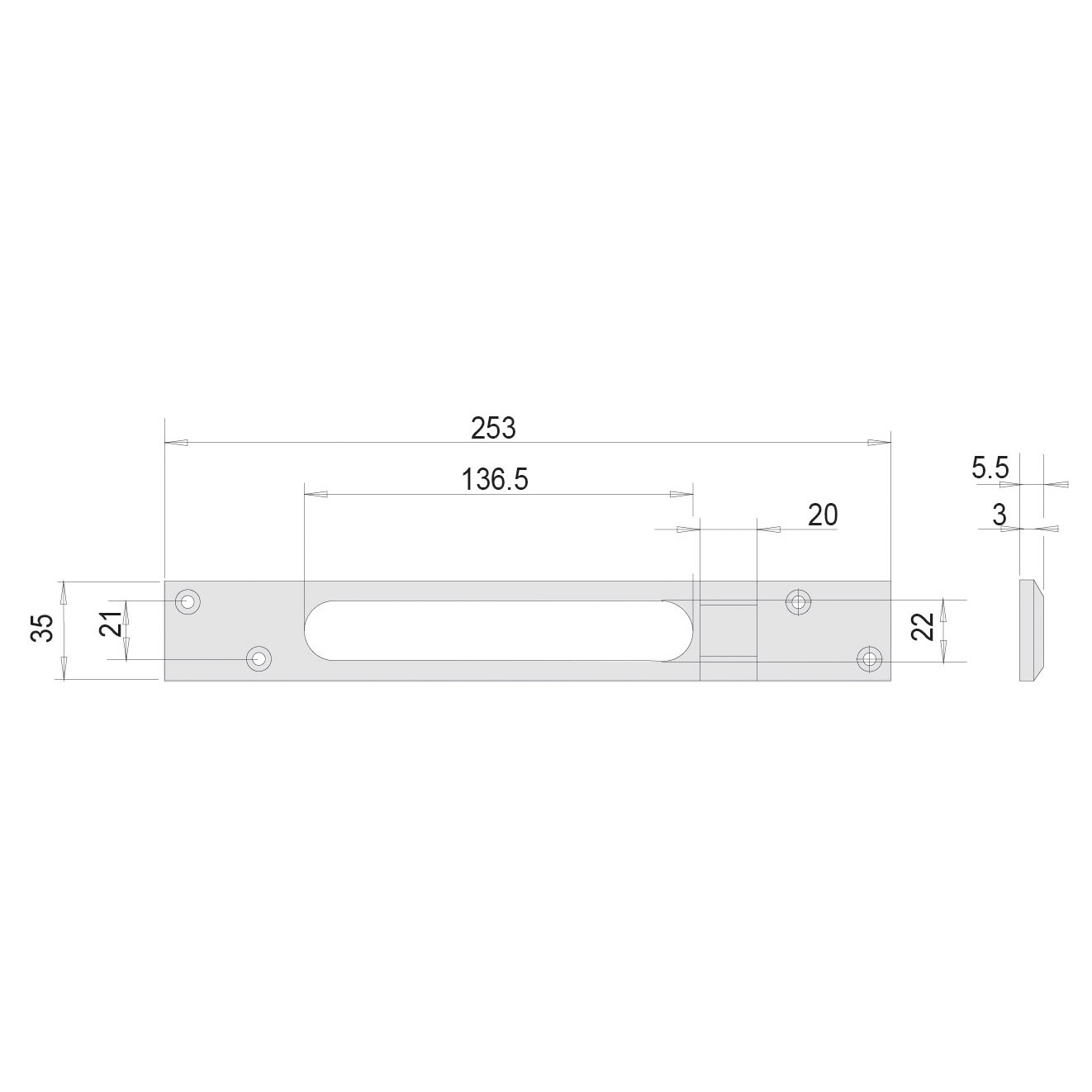 Art. 06220.00 contropiastra piana in acciaio nichelato. Per serrature elettriche art. 15510 – 15515 – 15530 – 15535 – 17510 – 17515 – 17530 – 17535. Dimensioni 35 x 5,5 x h 253 mm. Peso 0,132 kg.