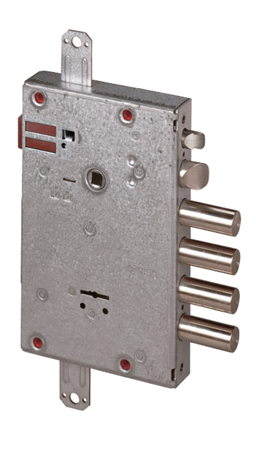 Art. 17515.68 CK Sistema Standardlock a doppia mappa chiusura triplice. Scatola, coperchio, catenacci e pistoni di ricarica in acciaio. Scrocco antiscasso reversibile nichelato, richiamabile elettricamente. Gruppo bobine con morsettiera incorporata, tensione 12V, 15W c.a. Pattino. Piastre di montaggio con la protezione in acciaio al manganese. Predisposizione per chiusure supplementari. Colonnette antischiacciamento per fissaggio viti. Rinvii in acciaio. 4 catenacci a 4 mandate. Interasse 85 mm. Entrata 64 mm. 3 chiavi corte e 1 chiave di servizio. Ambidestra. Peso 2,270 kg.