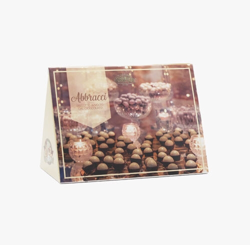 cuore di biscotto fritto avvolto in un doppio strato di cioccolato, fondente all’interno e bianco all’esterno.