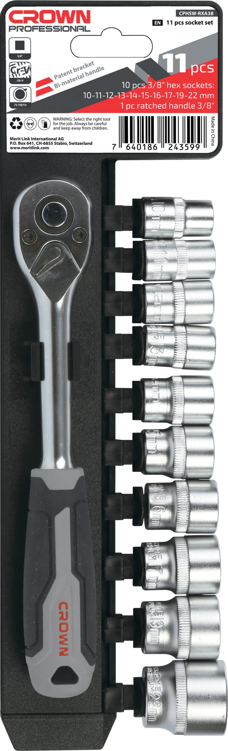 Crown, meccanismo brevettato e impugnatura bi-materiale. Attacco 1/2″. Contenuto: 1 manico a cricchetto, 10 chiavi a bussola 10/ 11/ 12 / 13 / 14 / 15 / 17 / 19 / 22 / 24.