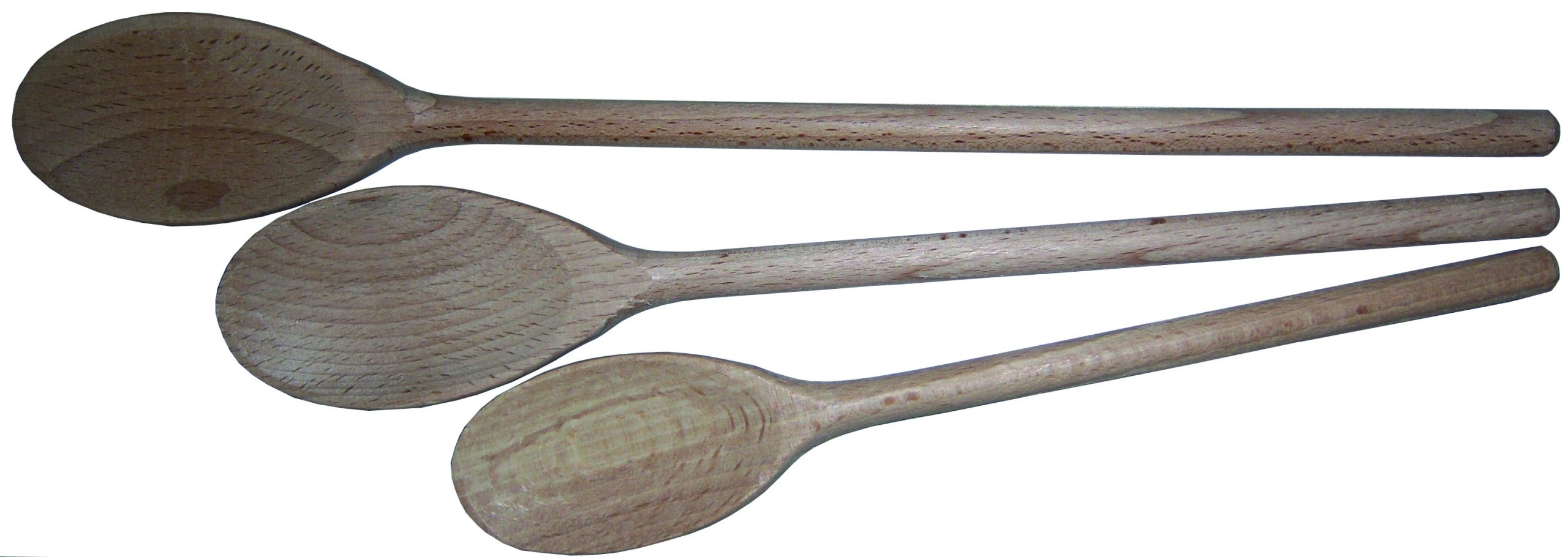 Set 3 cucchiai ovali in legno di faggio naturale, economico ed eco-sostenibile. Misure: 250 x 45 x 10 mm – 300 x 50 x 10 mm – 350 x 50 x 10 mm.