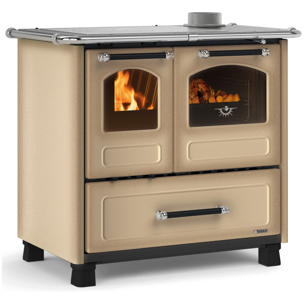 Porta fuoco con doppio vetro, interno ceramico. Porta forno con doppio vetro. Forno in acciaio smaltato porcellanato da 41 litri. Cassettone porta legna. Uscita fumi superiore lato destro ø 130 mm. Piedini per agevolare pulizia. Potenza termica nominale 7,5 kW. Volume riscaldabile 215 m3 . Classe energetica A+. Consumo orario 2,2 kg/h. Dimensioni 964 x 642 x h 853 mm. Colore cappuccino. Peso 125 Kg.