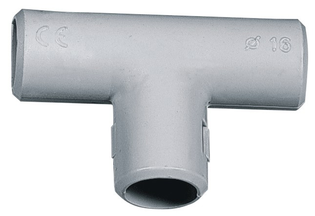 Serie TI – Derivazione a T per la connessione tra due tubi dello stesso diametro. Grado di protezione IP 40. Confezione da 2 pezzi colore grigio RAL 7035 Diametro tubo 16 mm