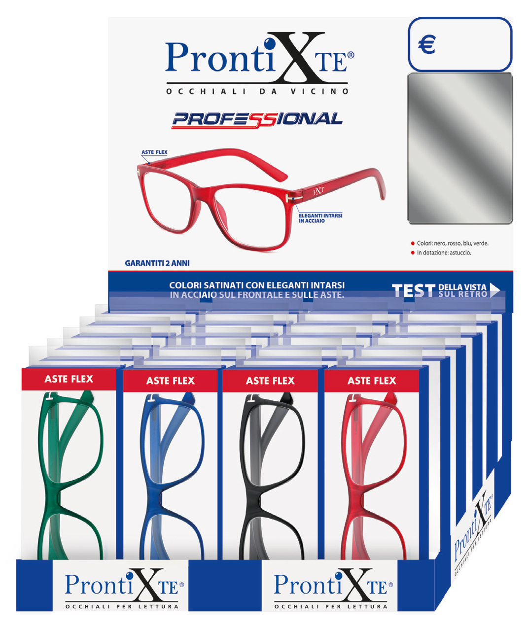 ‘PRONTI X TE’ Mod. PROFESSIONAL montatura in leggero materiale organico iniettato, lenti asferiche ultrasottili ed infrangibili. Astine flessibili con meccanismo a molla. Colori assortiti. Espositore da banco con 24 occhiali.Diottrie 1-1,5-2-2,5-3-3,5
