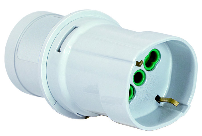 Art. 73.100 in materiale termoplastico autoestinguente. Adattatore industriale. Spina 2P+T – 16A – 200/250V 6h. Presa bipasso schuko 2P+T – 16A. Grado di protezione IP 44. Costruita in riferimento alle normative CEI EN 50250 e CEI EN 60309-1/2