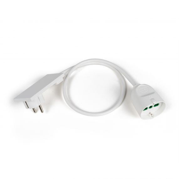 Art. 92.032 prolunga lineare salvaspazio. Cavo da 1 m. Sezione 3×1 mm H05VV-F. Spina a squadra schuko modello Clock 2P+T 16A. Presa schuko/bipasso 2P+T 16A. Colore bianco.