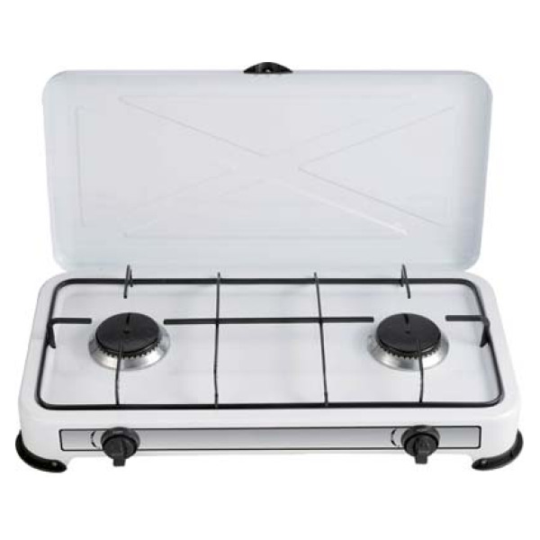 Con coperchio, doppio fuoco ad elevata potenza e griglia in acciaio. Dimensioni: lunghezza Cm. 58, larghezza Cm. 29, altezza Cm. 12. Peso Kg. 3,2.