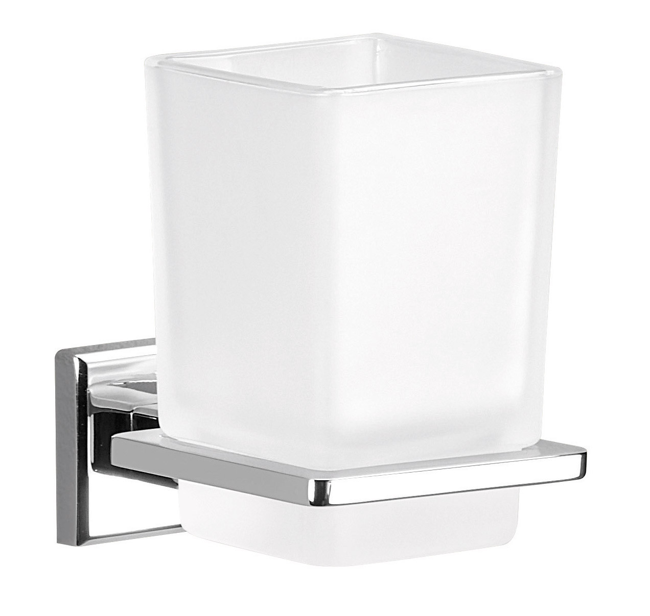 in acciaio inox e cromall, contenitori in vetro satinato Art. 6910 portaspazzolini. Portata max 7 Kg. 10 anni di garanzia. Dimensioni 7 x 10,5 x h 10,5 cm. Art. 6910