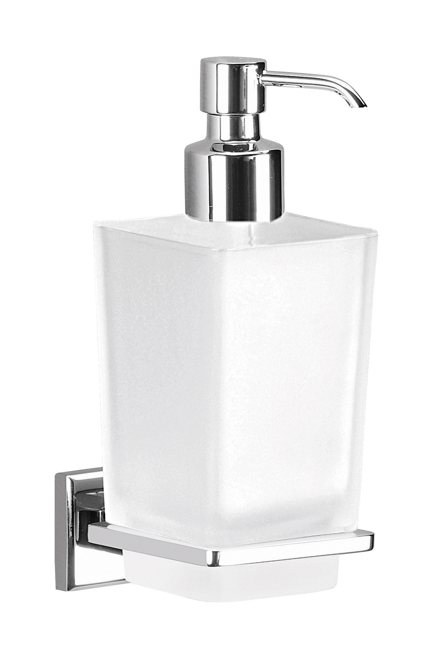 in acciaio inox e cromall, contenitori in vetro satinato Art. 6981 distributore di sapone con erogatore in metallo cromato. Portata max 7 Kg. 10 anni di garanzia. Dimensioni 7 x 10,5 x h 15,5 cm. Art. 6981