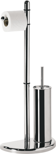 In metallo con portascopino e portarotolo a base semicircolare, ideale per piccoli spazi. Colore cromo. Dimensioni 29,6 x 18 x h 75 cm. Art. HI32