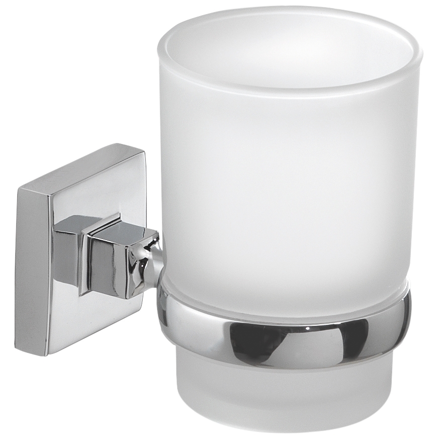 in acciaio inox e cromall, contenitori in vetro satinato. Art. OL10 portaspazzolini. Dimensioni 6,7 x 10,2 x 9,5 cm.
