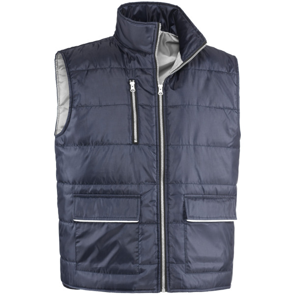 Mod. DUBAY 100% poliestere, imbottitura180 g/mq. Chiusura centrale con cerniera a vista. 2 tasche con chiusura in velcro e pattina con bordo riflettente, 1 tasca con cerniera sul petto lato destro. 1 tasca interna con chiusura in velcro. Colore blu navy. Taglia XXL