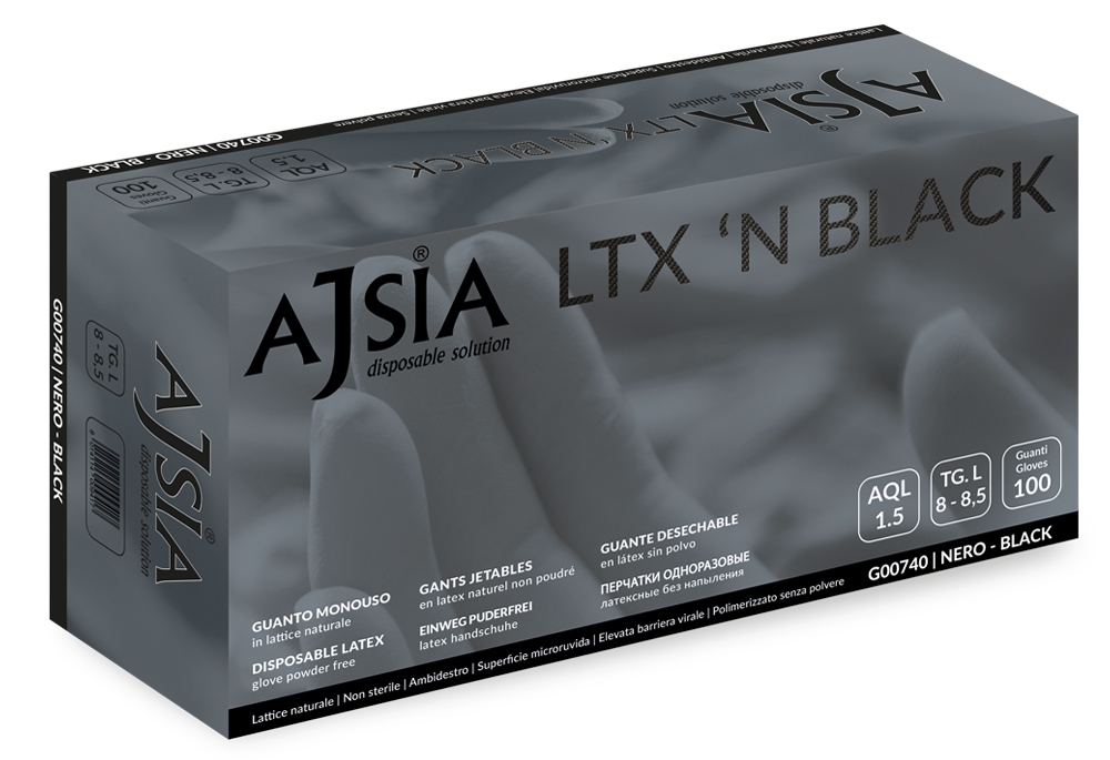 Il guanto monouso da esaminazione Ajsia G00740 LTX ‘N BLACK è realizzato in lattice naturale e polimerizzato senza polvere con trattamento interno Polymer Coated (rivestito internamente con polimero).