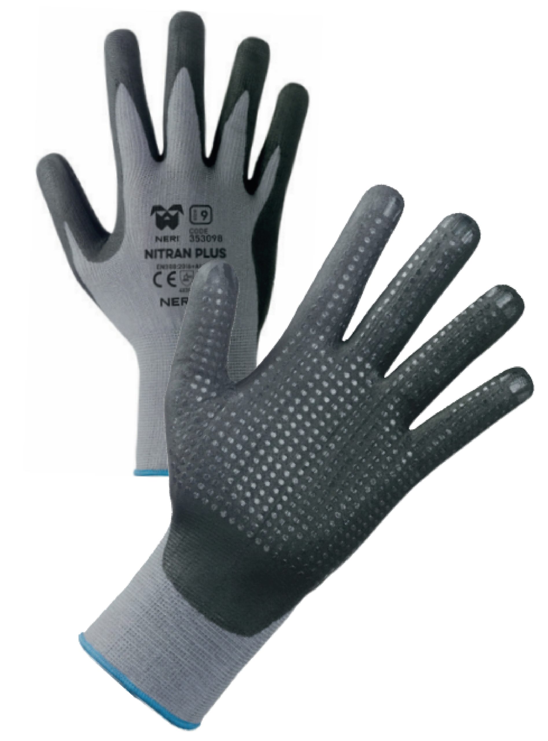 Mod. NITRAN PLUS maglia in nylon calibro 15 con rivestimento in nitrile schiumato sul palmo puntinato. Polso elasticizzato e dorso aerato che conferisce traspirabilita al guanto. Leggeri, garantiscono un ottima resistenza allabrasione. Forma ergonomica, assenza di cuciture. A norma CE EN 3882016 . Colore nero, grigio. Taglia 10