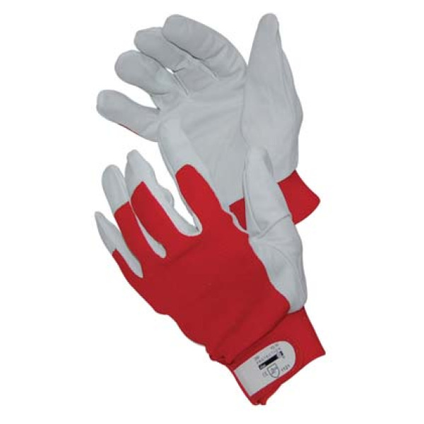 In pelle fiore di maialino di colore bianco. Dorso in tela rossa e polsino elastico con chiusura in velcro. Media resistenza all’abrasione allo strappo e alla perforazione. Dispositivo di protezione individuale (DPI), categoria 2. Protezione contro i rischi meccanici conforme alla normativa EN388, con livelli 2011X.